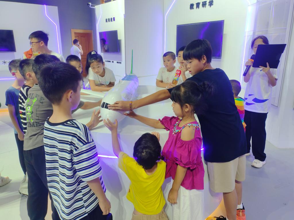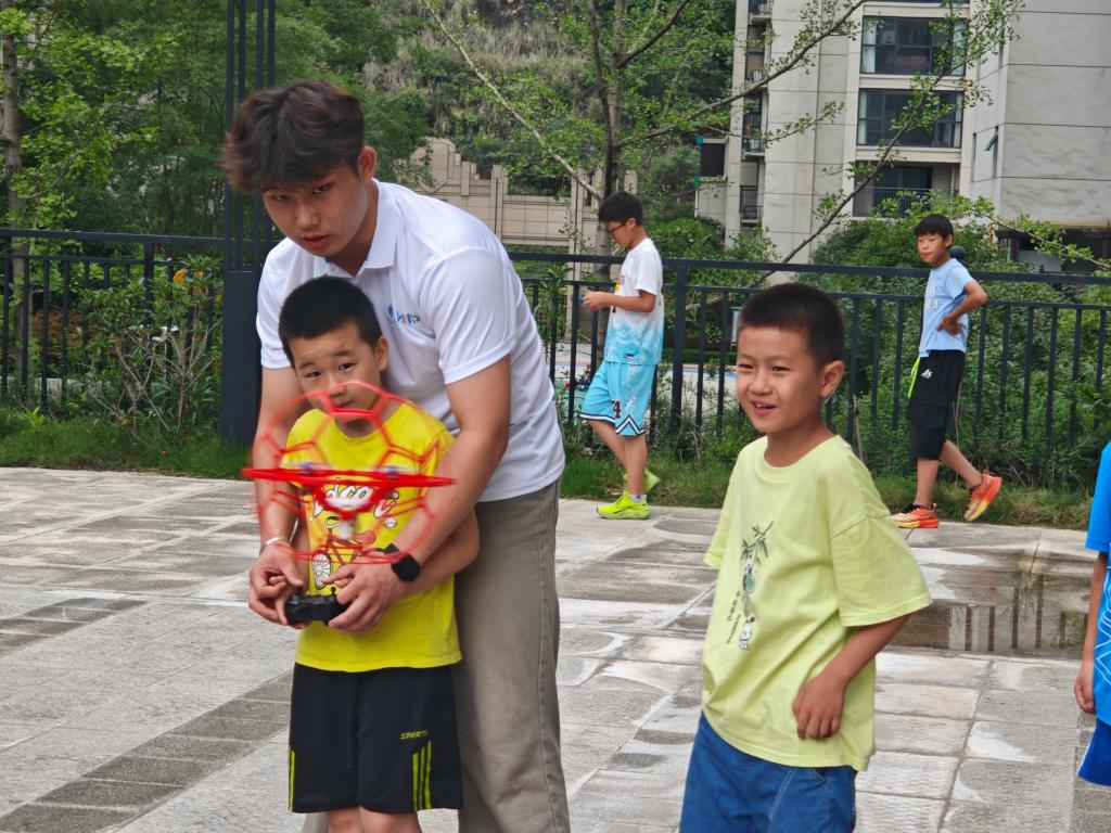 “纸上得来终觉浅,绝知此事要躬行。”理论课程结束后,志愿者带领孩子们开启户外飞行实践。在安全规范指导下,孩子们化身“小小飞手”,操控无人机体验“足球飞行”,通过精准控制无人机足球越障,在模拟竞技中理解飞行操控逻辑。当无人机在孩子们的操作下完成空中变向、精准悬停等动作时,孩子们脸上洋溢着兴奋的笑容,现场响起阵阵欢呼。“原来要根据风速调整遥控器的摇杆力度!”一位小朋友边操作边感叹。实践环节不仅让抽象的飞行原理变得可触可感,更通过模拟竞技场景,让孩子们直观理解低空经济在物流、赛事等领域的应用场景。
