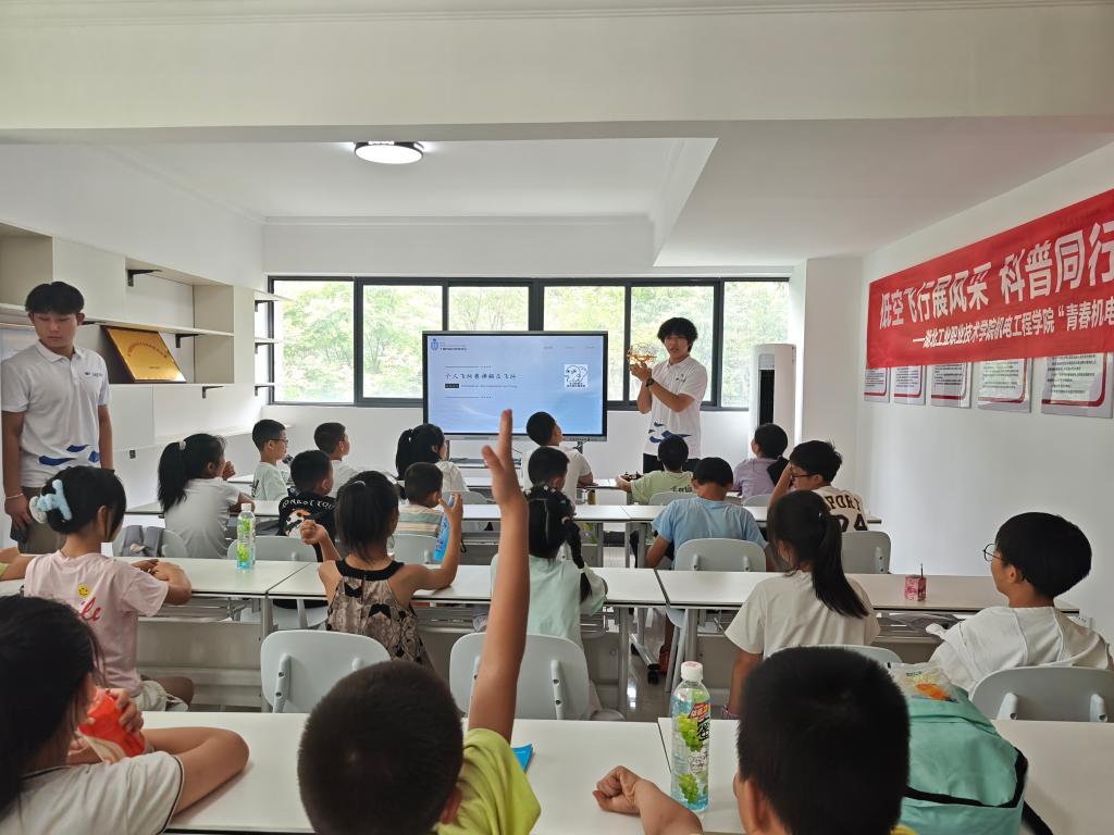 青年志愿者别出心裁,通过微课视频、PPT与实物展示相结合的方式,开展无人机发展历史和基础原理专题科普课程。课堂上,志愿者借助互动问答、知识小竞赛等趣味环节,将无人机从军用领域到民用场景的演进历程、空气动力学原理等专业知识,转化为通俗易懂的内容。孩子们踊跃举手参与 “飞机最早的定义是什么”“无人机最强大的属性是什么”等问题互动,在轻松愉快的氛围中解锁无人机知识,初步感知低空经济的科技魅力。