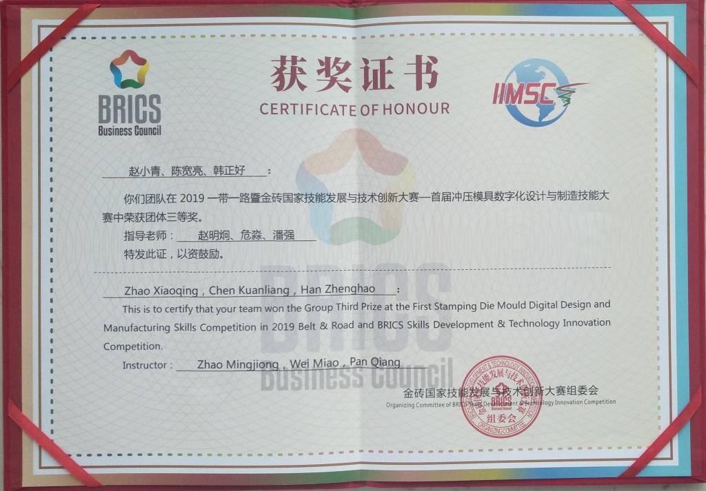 (通讯员:潘强)7月6-7日,由中国政府及金砖国家支持参与、金砖国家工商理事会(BRICS BC)主办的“2019年一带一路暨金砖国家技能发展与技术创新大赛”在山东举办。我院派队参加了“首届冲压模具数字化设计与制造”赛项的比赛,并获得三等奖。
