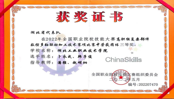新闻网讯8月18日,由国家教育部、发展改革委、人社部等35部门联合主办的2022年“中银杯”全国职业院校技能大赛(高职组)复杂部件数控多轴联动加工技术赛项在四川工程职业技术学院举行,由德赢官网德赢AC米兰中国官方网站潘强、赵明炯老师指导,韩子俊、卜永成参赛的团队荣获该赛项三等奖。