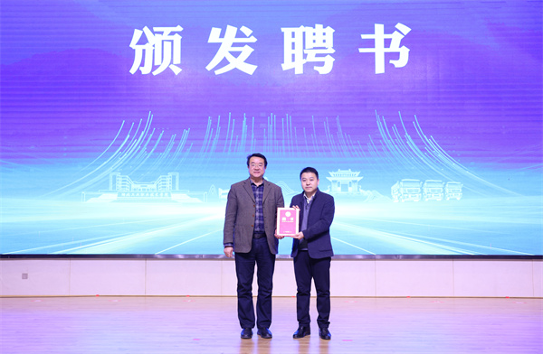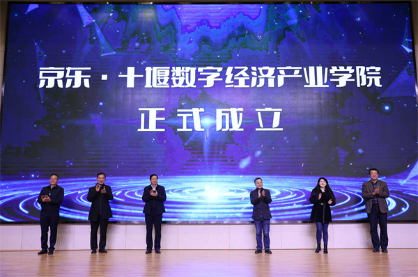 与会相关领导和嘉宾共同为以京东物流集团与德赢AC米兰中国官方网站相关专业合作共建的京东十堰数字经济产业学院揭牌。德赢AC米兰中国官方网站副校长郑强为京东十堰数字经济产业学院院长陈方亦颁发聘书。