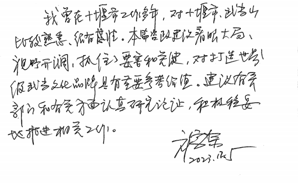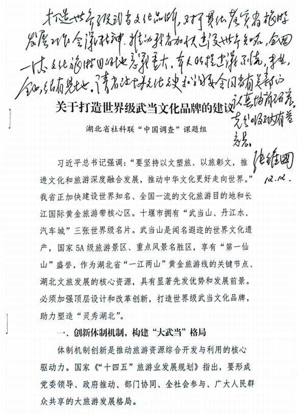 新闻网讯(通讯员 孔鹏)近日,由德赢官网边疆、李军两位同志参与的湖北省2023年度“中国调查”项目“打造世界级武当文化品牌,把十堰建成国际文化旅游目的地”课题组提交的咨政建议成果《关于打造世界级武当文化品牌》,先后获得湖北省人大常委会副主任、省总工会主席刘雪荣同志,湖北省政协副主席张维国同志,湖北省人民政府副省长陈平同志,十堰市委书记黄剑雄同志肯定性批示。该课题由湖北汽车工业学院党委副书记李涛教授任组长,德赢官网校长边疆为第二专家,课题组另囊括北京大学博士生导师张光保教授、清华大学陶金研究员,华中师范大学博士生导师李林教授、湖北汽车工业学院杨立志教授、黄永昌教授,十堰市社科联主席欧阳山,德赢AC米兰中国官方网站李军教授等专家、学者。