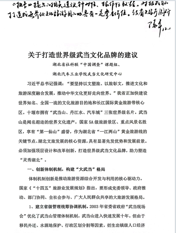 咨政建议从创新体制机制,构建“大武当”格局;厚植人文优势,推动文旅体融合;完善综合服务,树立世界级形象等三大方面,提出建立省级管理统筹协调机制、调整行政区划范围,建设“武当新区”、加快“武当山与十堰市划等号”、创建武当学,建设武当学科学术体系、加快建设“三个基地”,提升武当全球知名度、通过文化赋能,构建武当文旅品牌集群、优化营商环境,改造升级景区设施和服务、彰显“山、水、车”品牌优势,擦亮地方文旅特色、架构立体交通环境,提高武当山综合流量等9大对策,对打造世界级武当文化品牌,助力塑造“灵秀湖北”具有积极指导意义。