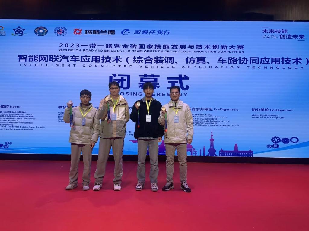 新闻网讯(通讯员 张超)12月14日至17日,第七届金砖国家技能发展与技术创新大赛智能网联汽车应用技术赛项在上海交通职业技术学院举行。经过激烈比拼,德赢官网汽车工程学院张超、陈高峰组成的教师代表队以职工组总分第一的成绩力夺金牌,李书洋、綦凌组成的学生代表队在高职组喜获银牌。
