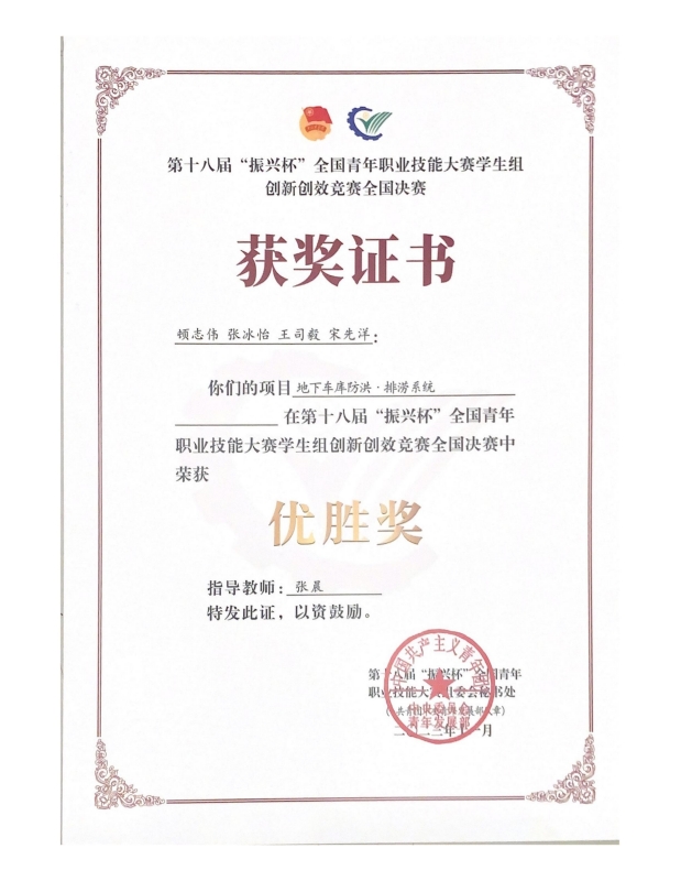 新闻网讯(通讯员 玉声)近日,从团省委传来喜讯,由张晨老师指导的德赢官网顿志伟等同学创新项目《地下车库防洪·排涝系统》在第十八届“振兴杯”全国青年职业技能大赛学生组创新创效竞赛全国决赛中荣获优胜奖。湖北省共28个项目获奖。