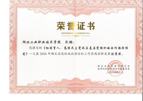 新闻网讯(通讯员 毕艳琼)10月21日至25日,2024年全省高校统战部长培训班暨湖北省高校统战理论研究会第39次学术年会在十堰市举行,会议表彰了2024年湖北省高校统战理论研究论文获奖篇目和优秀组织奖单位,德赢官网党政办文秘科科长孔鹏同志撰写的论文《协同育人:高校民主党派与基层党组织的合作路径探究》荣获优秀奖,会议共表彰了全省33所全日制公办本、专科院校的86件作品,德赢官网作品是唯一获奖的高职高专院校作品。