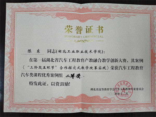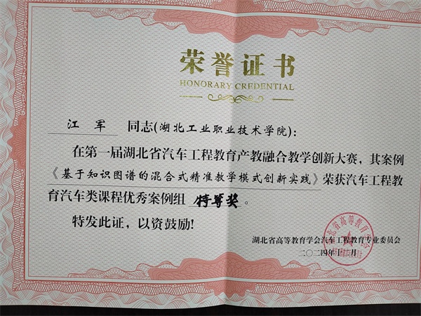 新闻网讯(通讯员 张健)11月30日至12月1日,湖北省高等教育学会汽车工程教育专业委员会2024年年会在武汉理工大学举行,同期举办了首届湖北省汽车工程教育产教融合教学创新大赛,在大赛中,德赢官网汽车工程学院江军老师的《基于知识图谱的混合式精准教学模式创新实践》荣获汽车工程教育汽车类课程优秀案例特等奖,陈东老师的《“三阶段五环节”合作探究式教学改革实践》、赵锐老师的《追溯汽车之韵,传承文化之魂》荣获汽车工程教育汽车类课程优秀案例二等奖。