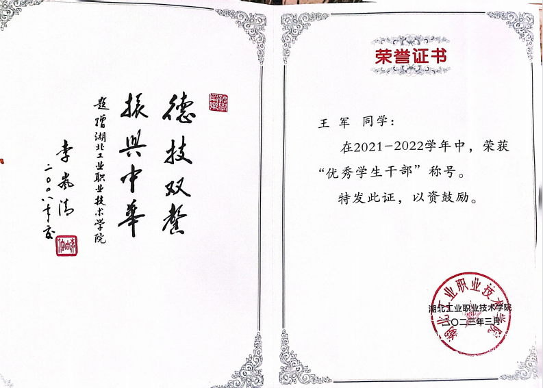 1.荣获“2022年校级优秀学生干部”称号